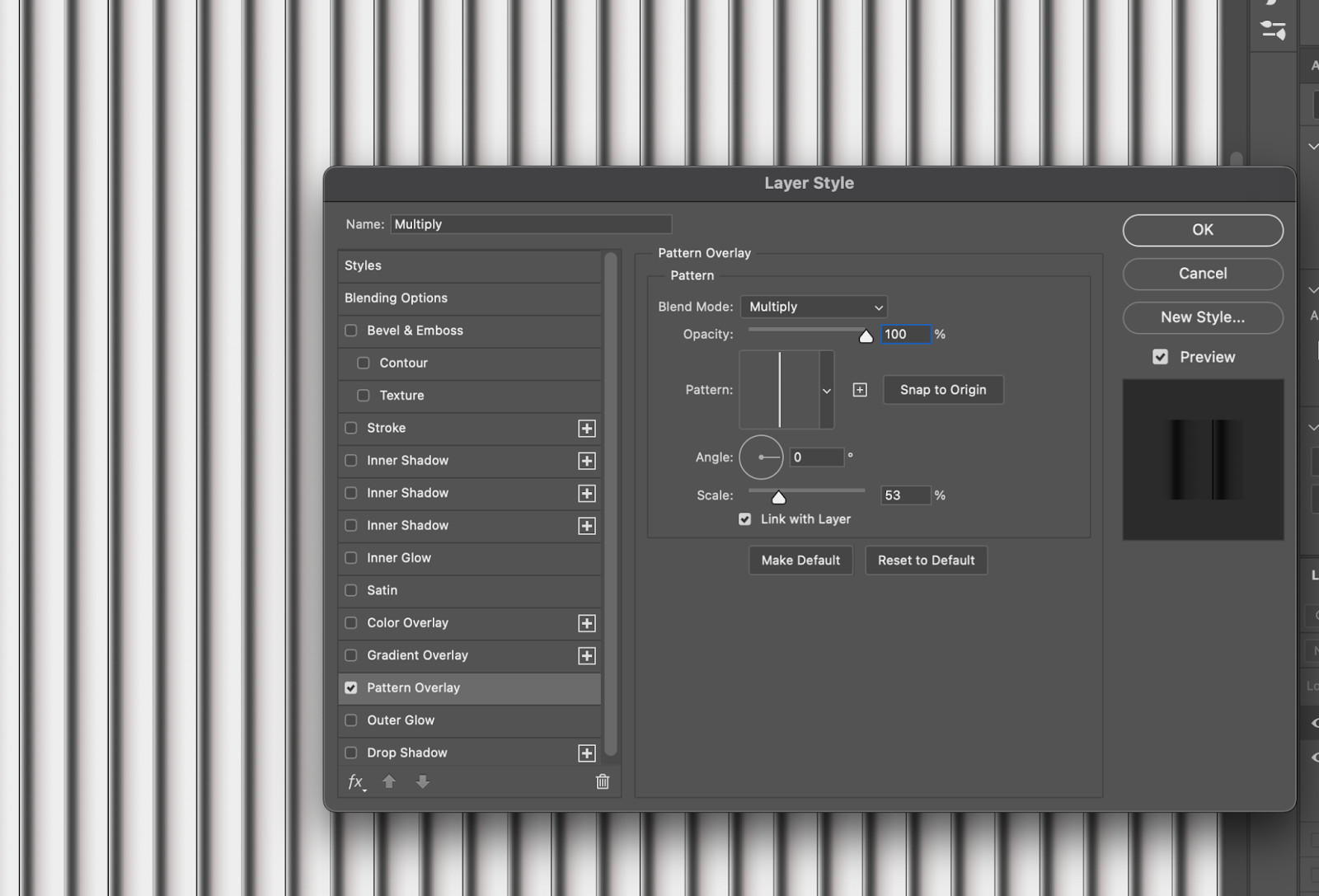 Ajoutez un nouveau calque puis accédez à Calque> Style de calque> Superposition de motifs. Sélectionnez le motif que vous avez créé. Modifiez l’échelle si vous souhaitez qu’elle soit plus grande ou plus petite. Après cela, enregistrez ce fichier et nommez-le « displace-map ». Ce sera ainsi que nous déformerons notre image.