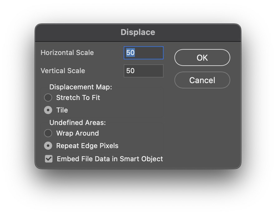 Convertissez l’image en objets intelligents et accédez à Filtre> Distorsion> Déplacer. Jouez avec quelques valeurs, pour cette image j’ai utilisé les valeurs ci-dessous.