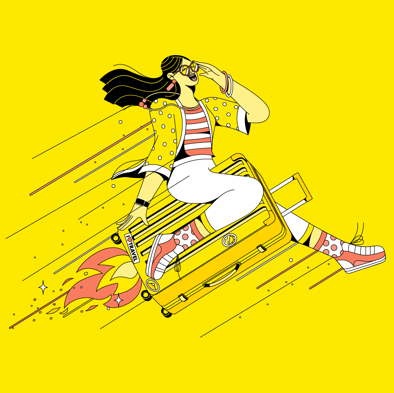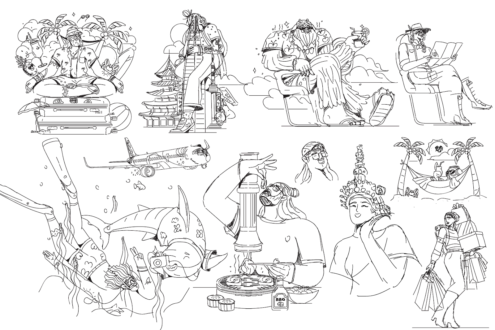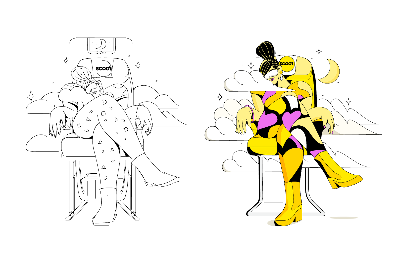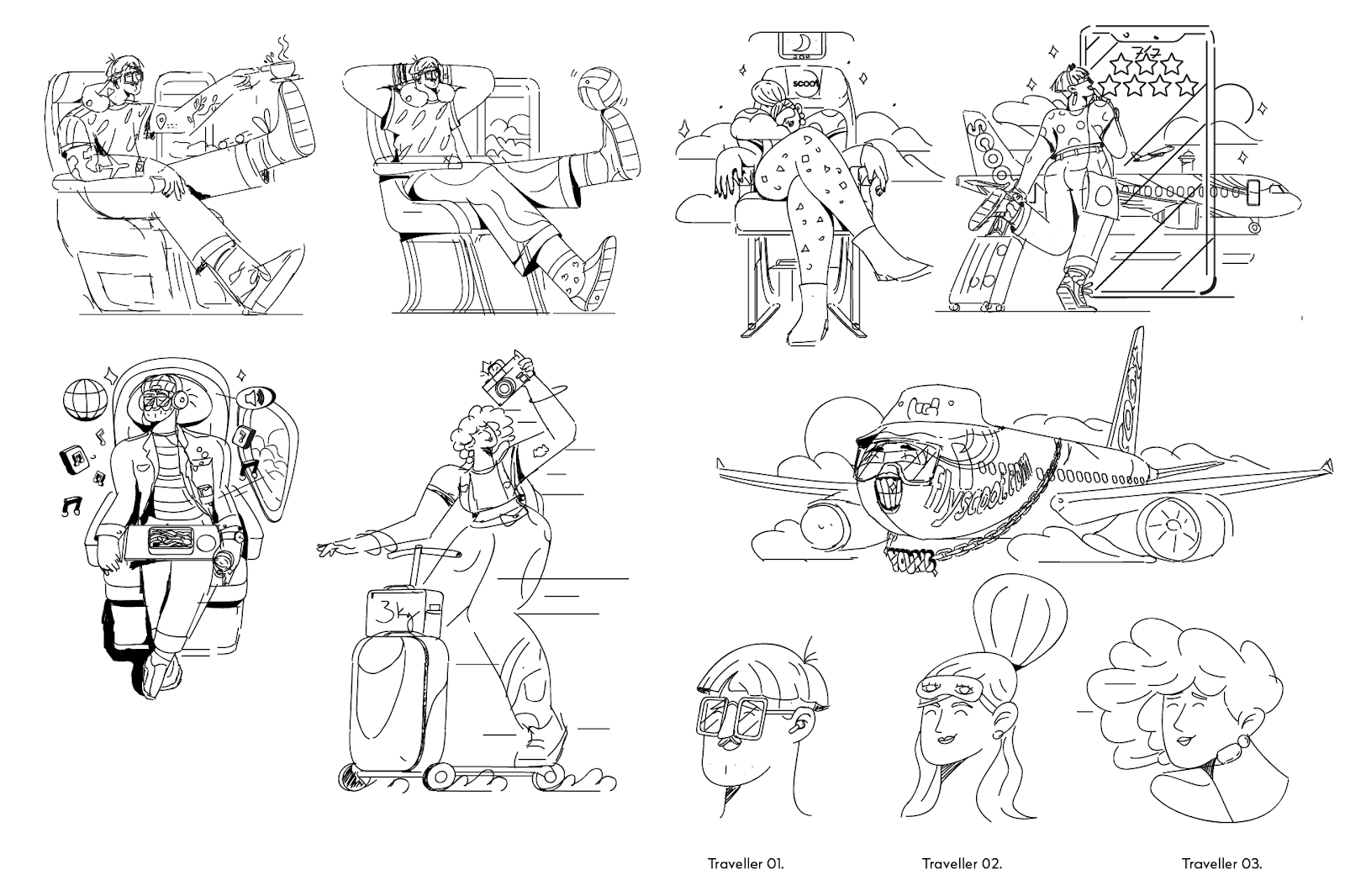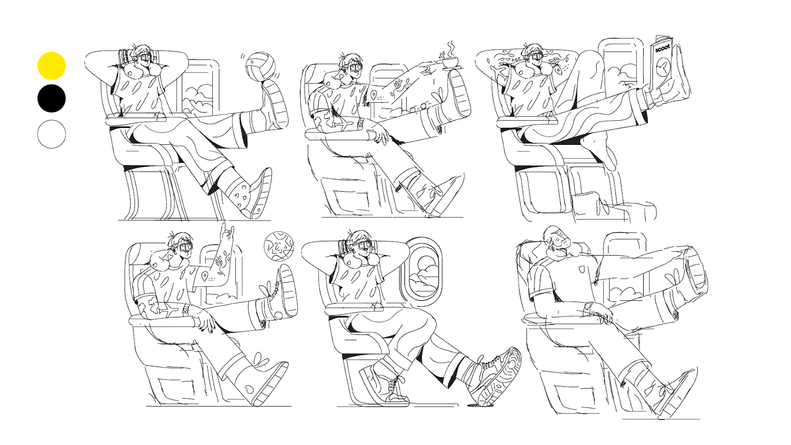 Les illustrations ont été classées en quatre thèmes principaux : les passagers, les voyageurs, les destinations et l’équipage Scoot, chacun mettant en évidence différents aspects de l’expérience de voyage avec Scoot. Par exemple, la catégorie Passagers a donné vie aux fonctionnalités de la compagnie aérienne telles que l’espace supplémentaire pour les jambes et les commodités à bord, tandis que les illustrations Destinations célébraient la richesse culturelle des villes desservies par Scoot.